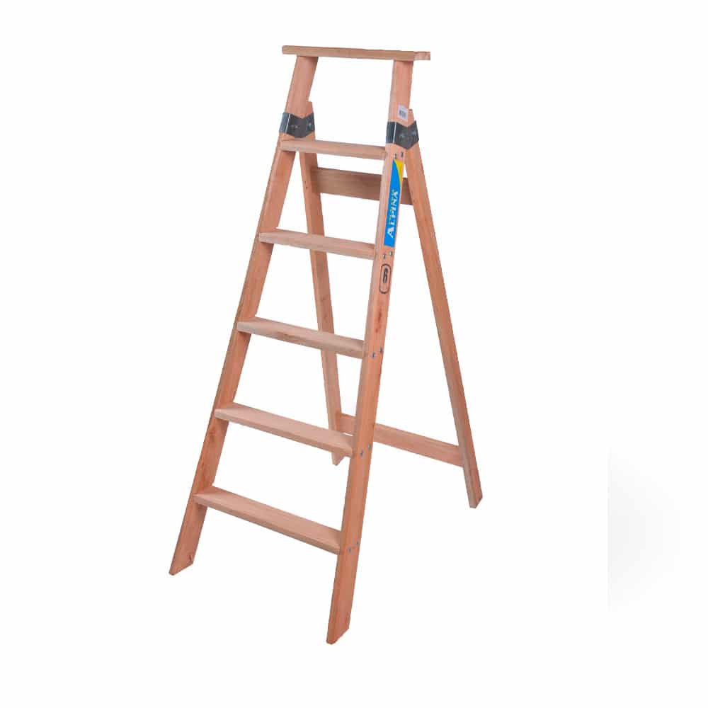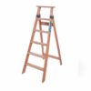 - Escalera de madera ideal para uso hogareño con bisagra galvanizada y escalones planos.