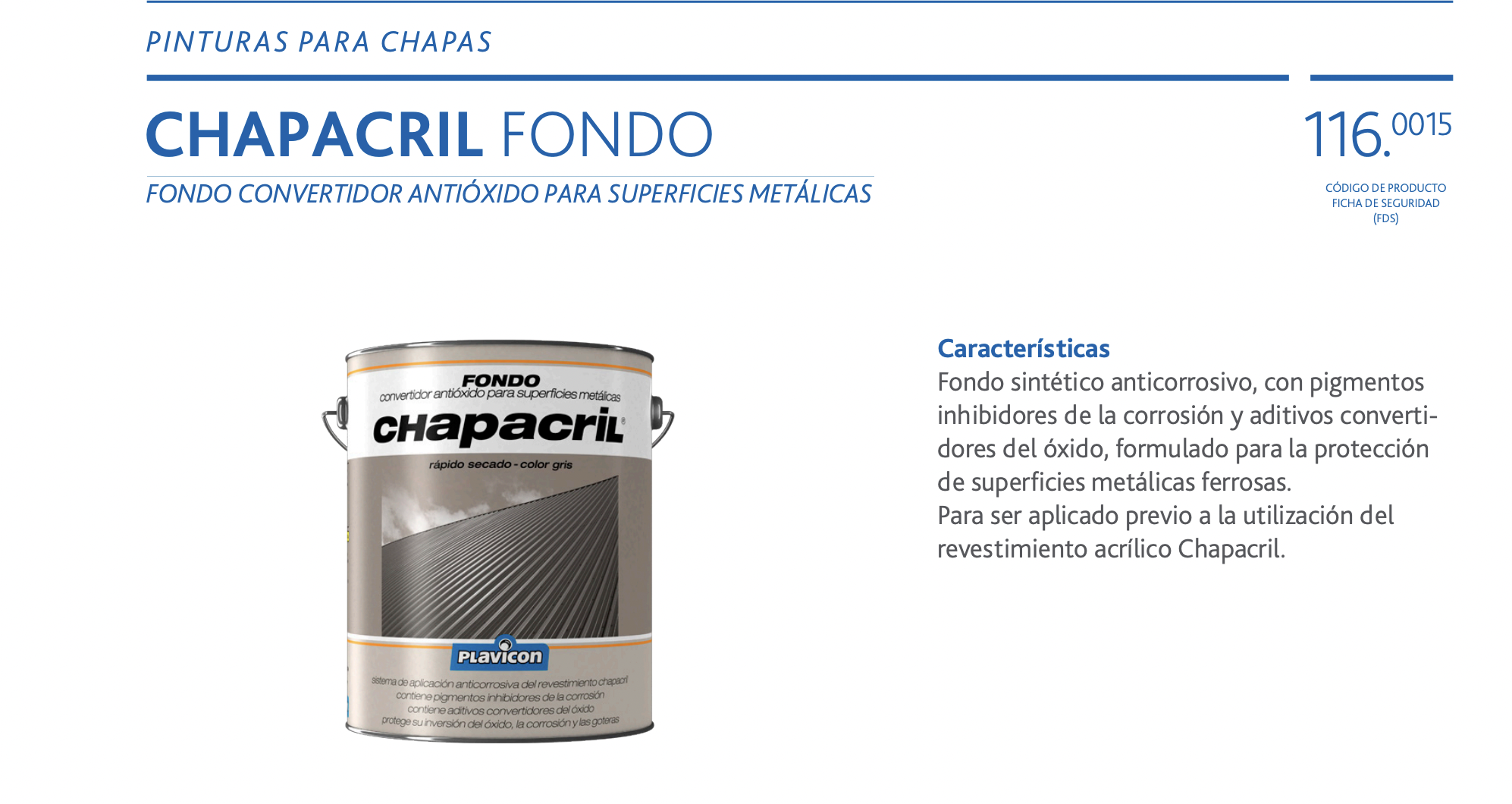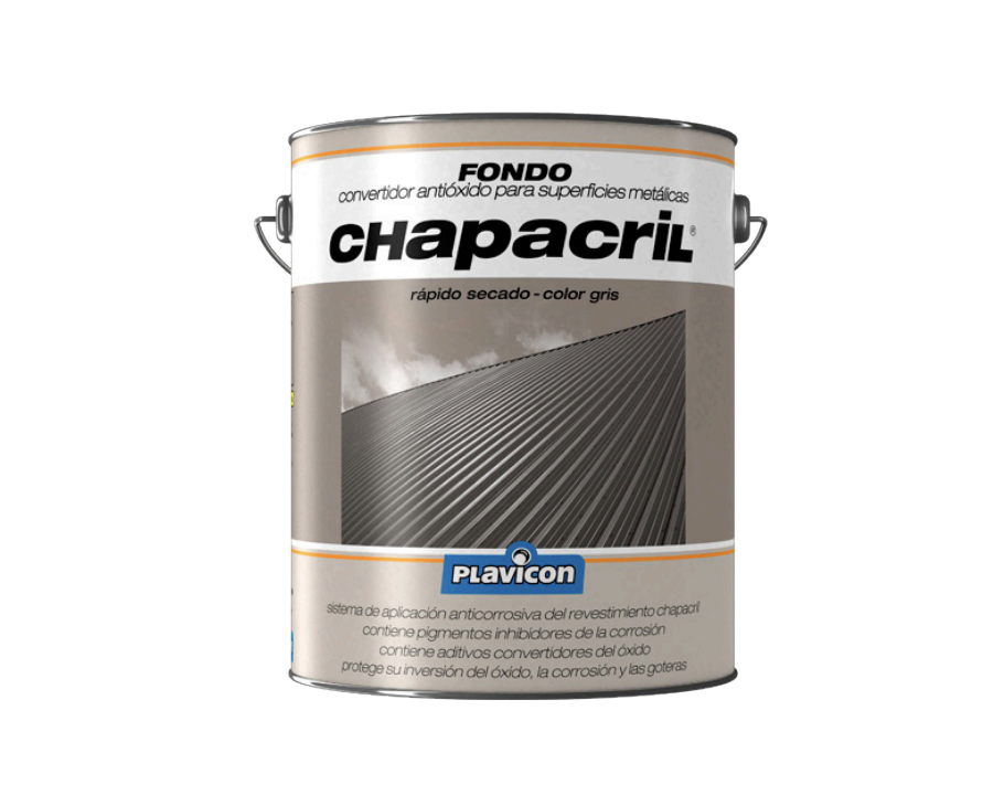 Características Fondo sintético anticorrosivo, con pigmentos inhibidores de la corrosión y aditivos convertidores del óxido, formulado para la protección de superficies metálicas ferrosas. Para ser aplicado previo a la utilización del revestimiento acrílico Chapacril.