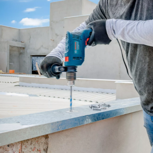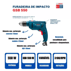 El Taladropercutor Bosch GSB 550 RE es una herramienta eléctrica con una potencia de 550 W, diseñada para perforar en albañilería, madera y metal, tanto con como sin impacto. Cuenta con un botón conmutador que permite cambiar fácilmente entre modos de perforación y atornillado. Además, su función de reversión facilita la extracción de brocas y tornillos.
